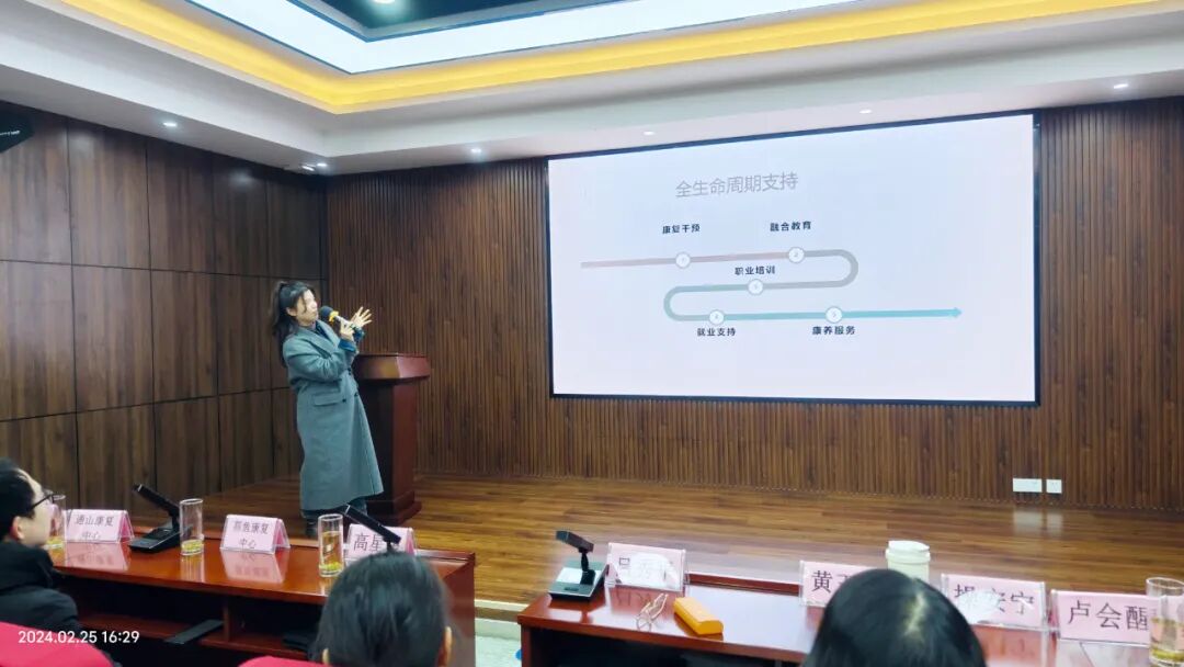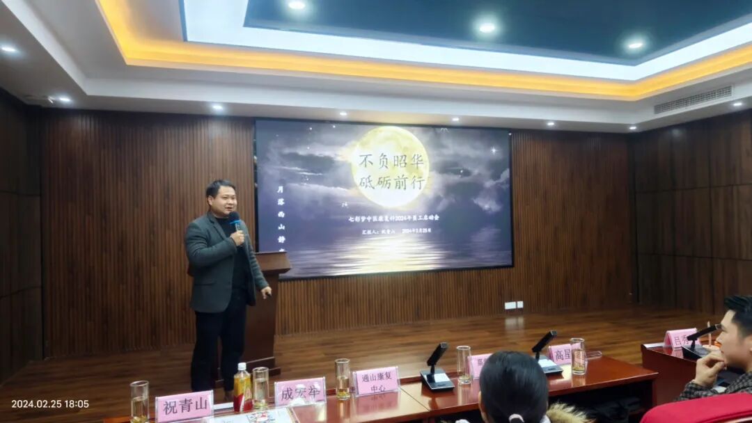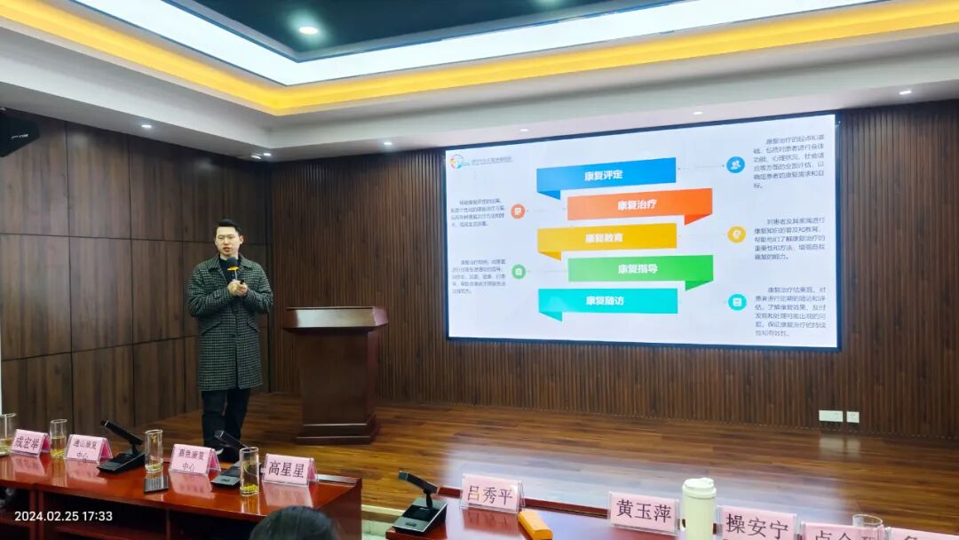 医疗康复部成宏举老师和中医康复部祝青山老师分别就各自的领域进行了工作汇报。成老师强调了通过有效的专科康复方法改善病、伤、残者的功能障碍的重要性;而祝老师则分享了中医康复课研的总结及未来工作规划。